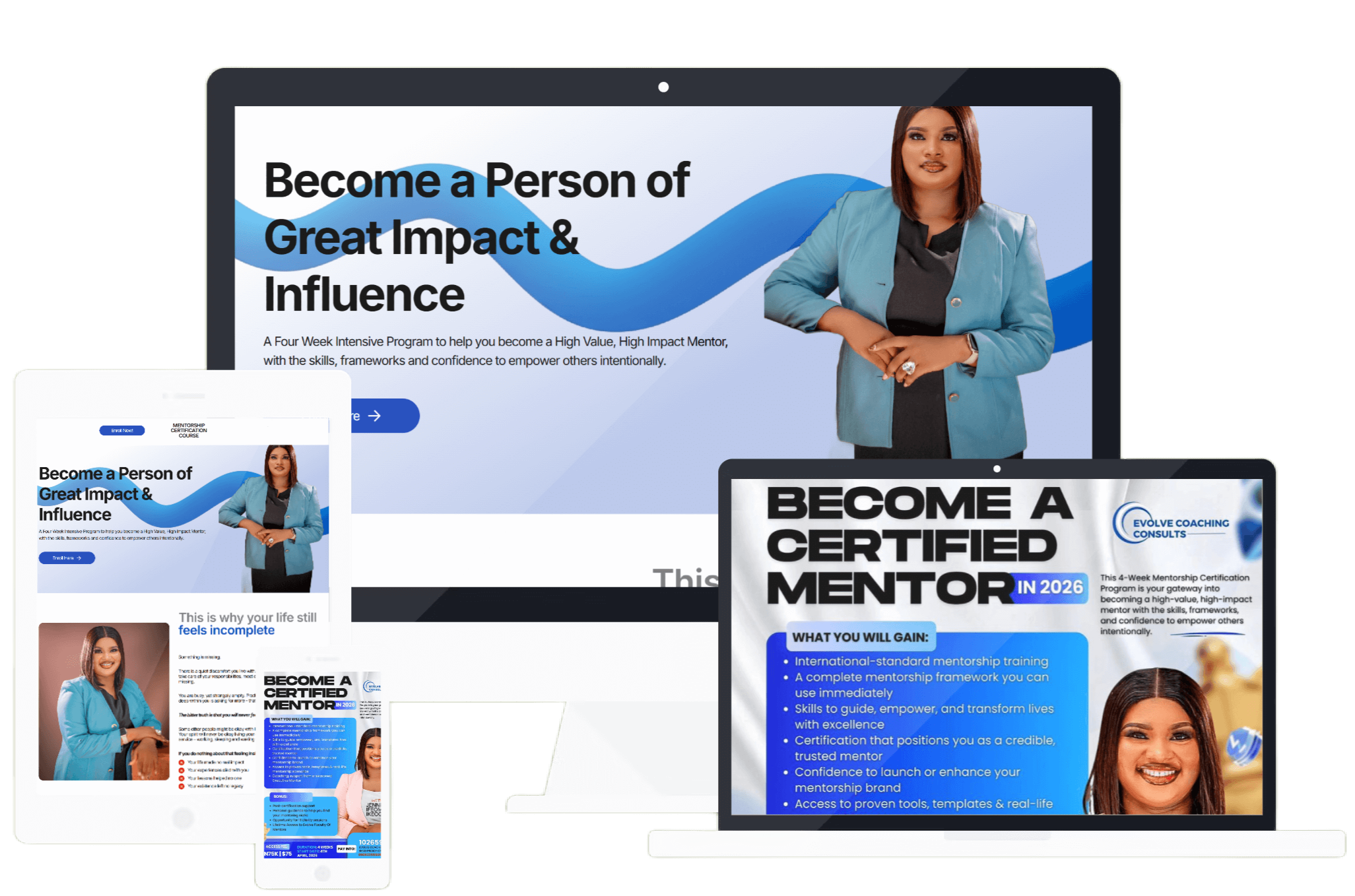 Jennifer Ifeoma Ikeogu is a Certified Mentor, Mentorship Strategist, and Founder of Evolve Coaching Consults, with years of hands-on experience mentoring women across leadership, purpose, personal growth, and productivity.Widely known as the Mentorship Queen, Jennifer has trained, coached, and certified aspiring and existing mentors who desire to mentor with structure, impact, and integrity not guesswork. Her work is rooted in one belief: mentorship is not a title, it is a responsibility that requires skill, clarity, and emotional intelligence.She is the founder of Evolve Mentorship Academy, where young women are equipped to discover their purpose, overcome imposter syndrome, find their voice, and build capacity for global relevance. Through her mentorship frameworks, Jennifer has helped women transition from passion to purpose, and from calling to competence.Jennifer is also the author of life transforming books , where she explores intentional growth, leadership, and the power of healthy mentoring relationships. Beyond theory, she brings real-life mentoring experience, having led high-impact group mentoring programs, certification trainings, leadership sessions, and private coaching for visionary women and professionals.As a Certified Mentor and Mentor Trainer, Jennifer doesn’t just teach what mentorship is — she teaches how to mentor responsibly, ethically, and effectively. Her certification programs are designed for individuals who want to mentor with confidence, credibility, and lasting impact.